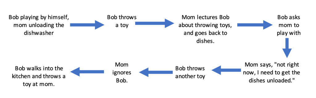 In this situation, the most likely function of Bob’s negative behavior was the desire for attention. How do we know this? Look at what immediately happens prior to Bob’s negative behavior (which was throwing toys)… he was either not getting any attention at all, or had just been told by his mother that she couldn’t give him attention. Whether he would have been able to verbalize the need or not, Bob wanted attention and was willing to do anything to get it.