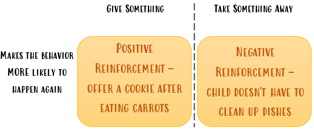 For my own purposes as a therapist, and for the purposes of parenting, I think of “positive consequences” as praise and rewards, and negative consequences as any sort of “punishment.” This may not be technically correct, but for the purposes of parenting, it works. Again, if you want to get a little more technical, you can read Crash Course on Reinforcement (Positive and Negative).